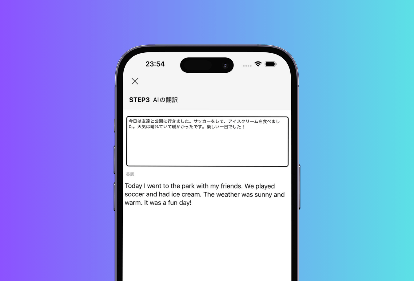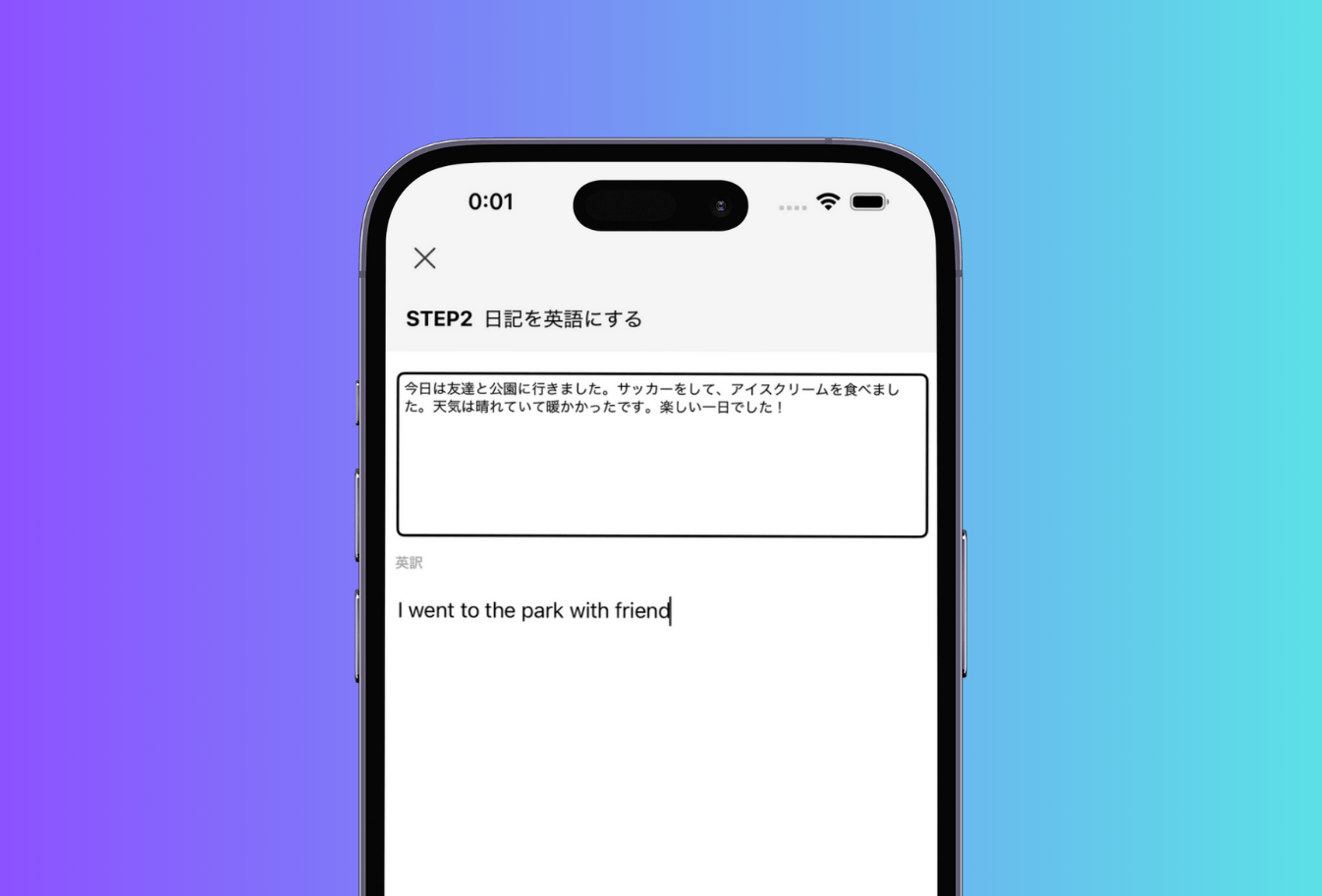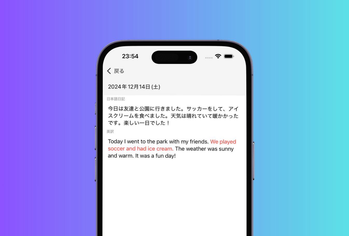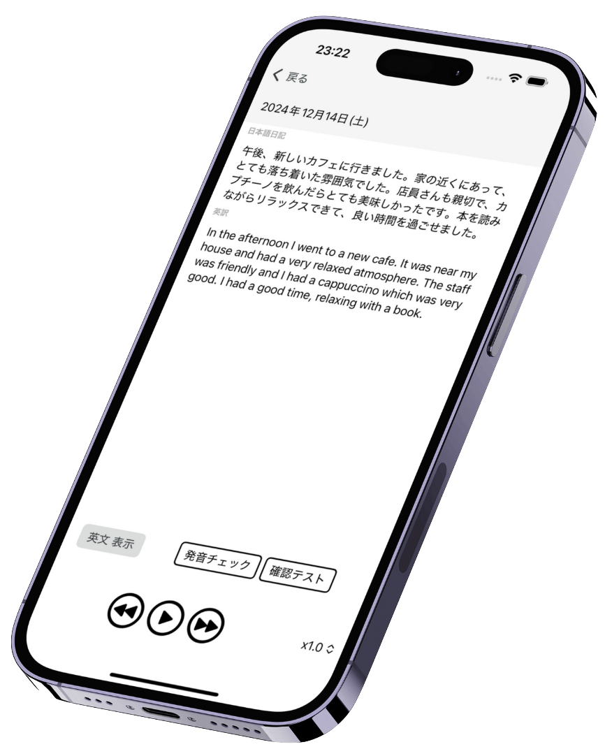 AIが書いた日記を元に英文に翻訳します。 自分が書いた英語との違いを見て学習しましょう。